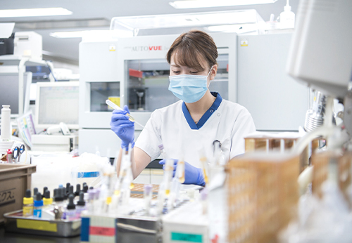 その他、用手法によるウィルス抗原の簡易検査、患者さんに直接接する検査としてはピロリ尿素呼気試験、採血室での外来患者さん、病棟に出向いての入院患者さんの採血業務なども行っています。