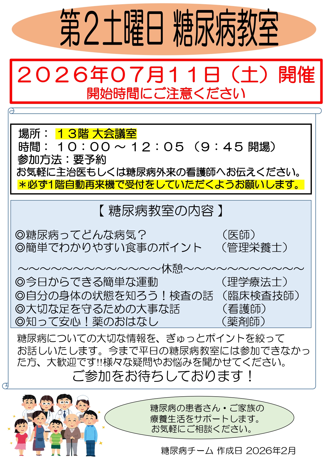 2026年07月11日(土)に、糖尿病教室を開催します。