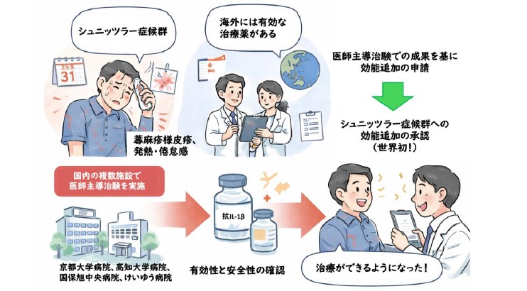 蕁麻疹様皮疹や発熱・倦怠感をきたすシュニッツラー症候群に対して、海外には有効な治療薬があるが、日本では使用できなかった。そこで、国内の複数施設で医師主導治験を実施し、その成果によって、世界初となる効能が追加された。(© 2026 Naotomo Kambe. Image created with ChatGPT5.2)
